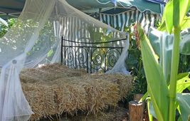 Мини-отель фермера состоит из натянутого тента, под которым установлены металлические кровати. В роли матрасов выступают обычные мешки, набитые соломой, вместо пола – коврики из войлока, вместо стульев – пеньки от деревьев и сетка от насекомых вместо полога над кроватями. Таким образом постояльцы фермера круглосуточно живут на свежем воздухе.